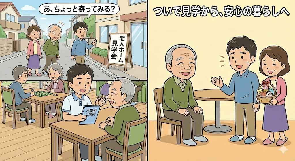 「お父さん、そろそろ一人暮らしも心配だし、老人ホームを見学してみない?」